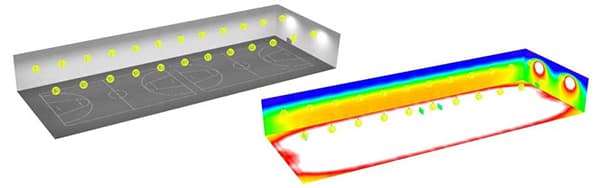 A: Unsere Dialux-Simulationen berücksichtigen Pfeiler, Zwischengeschosse und unebene Decken.